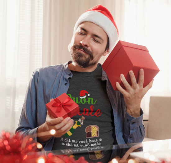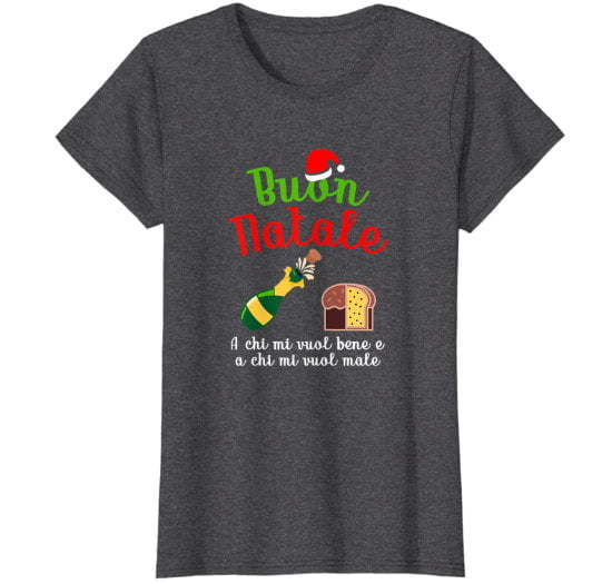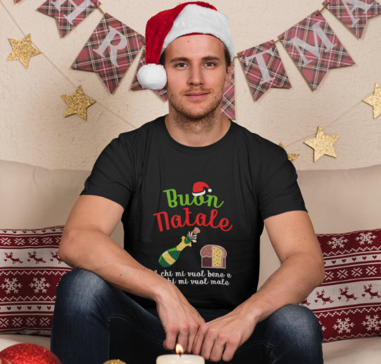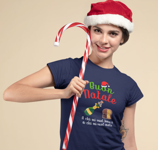 This design is a variation of my other Italian Christmas T-shirt. As well as a bottle of prosecco and panettone, it features the Italian text: Buon Natale, a chi mi vuol bene e a chi mi vuol male, which means “Merry Christmas to those who love me and to those who hate me.”