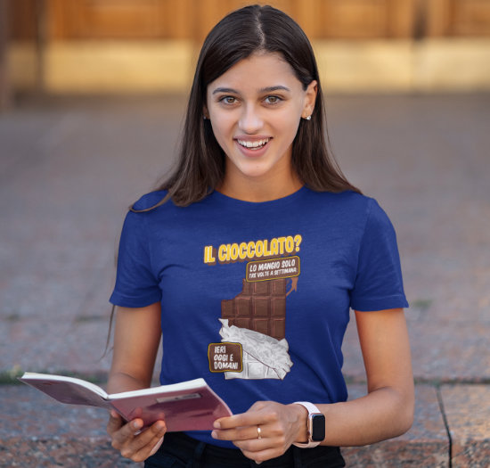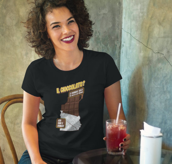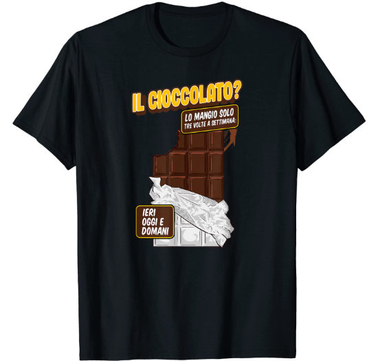 Or maybe I had myself in mind when I was thinking about this design. Featuring the Italian text: “Chocolate? I only eat it three times a week: yesterday, today and tomorrow”.