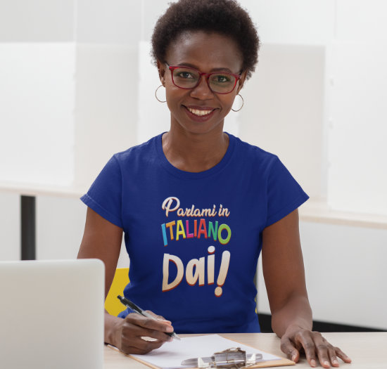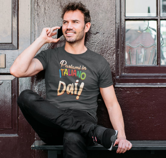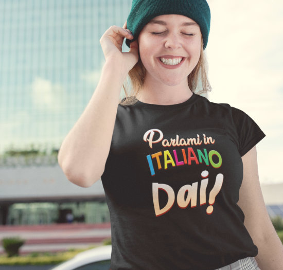 This t-shirt features the text Parlami in italiano, dai! which means “Talk to me in Italian, come on!”